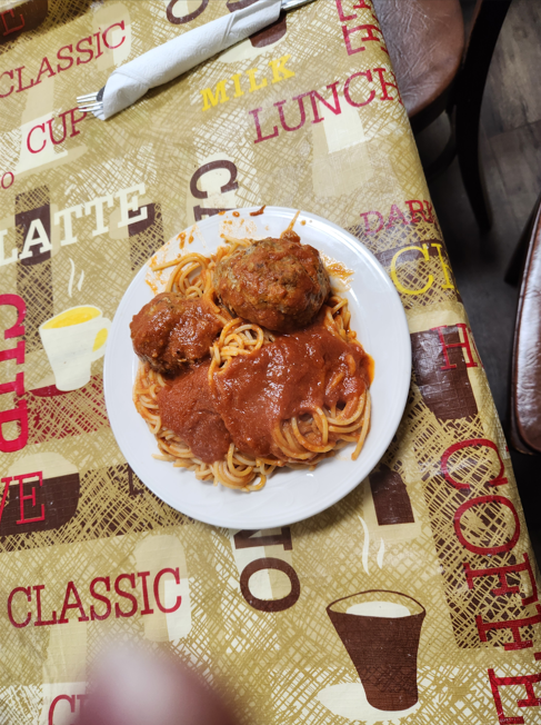 ARRIVED WITH A PLATE OF SPAGHETTI AND MEATBALLS TO WHICH WE ADDED A GLASS OF WINE,